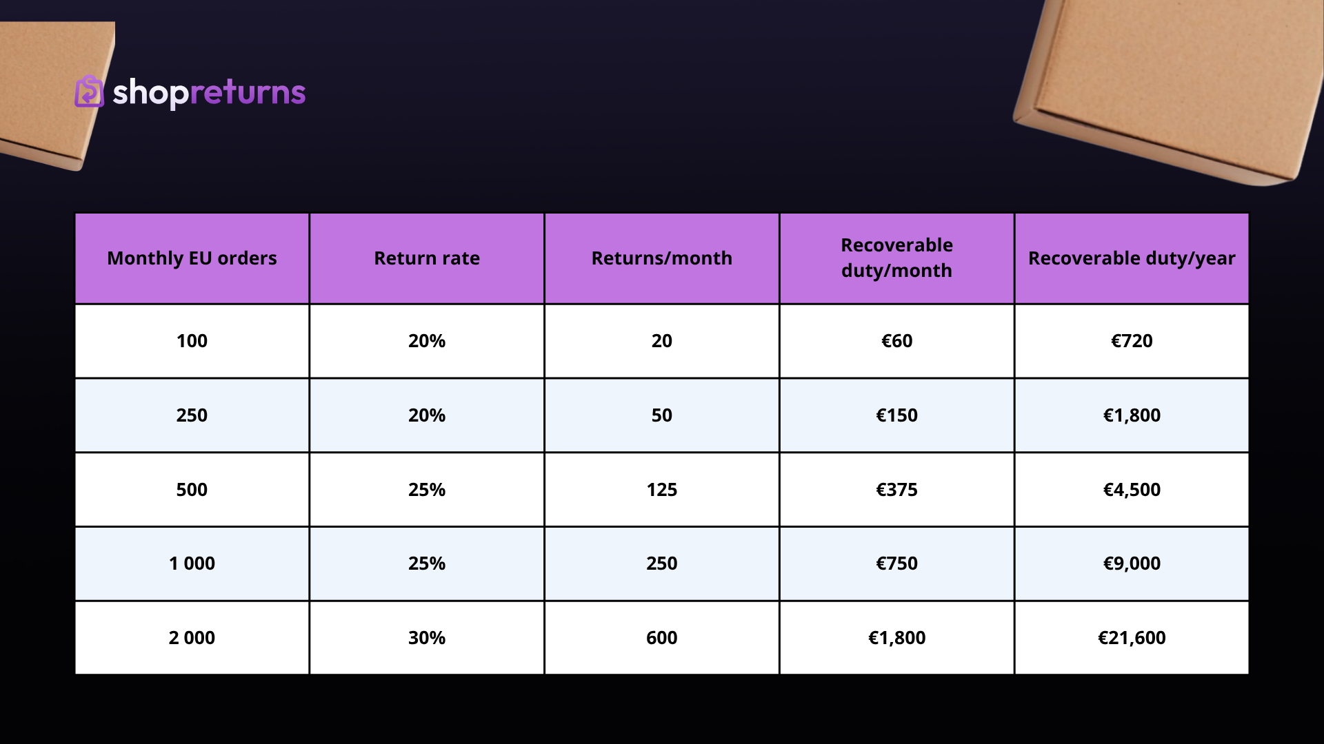 Monthly EU orders × return rate × €3 × 12 = your annual unrecovered duty.